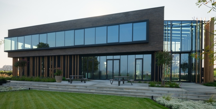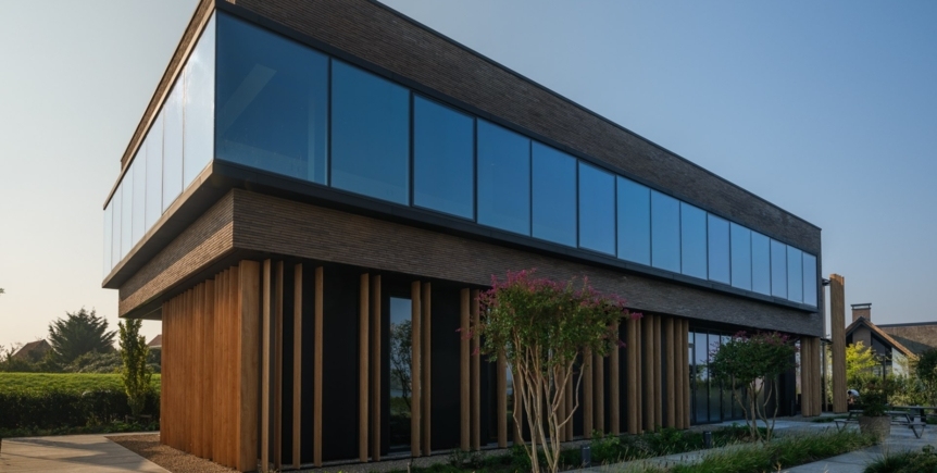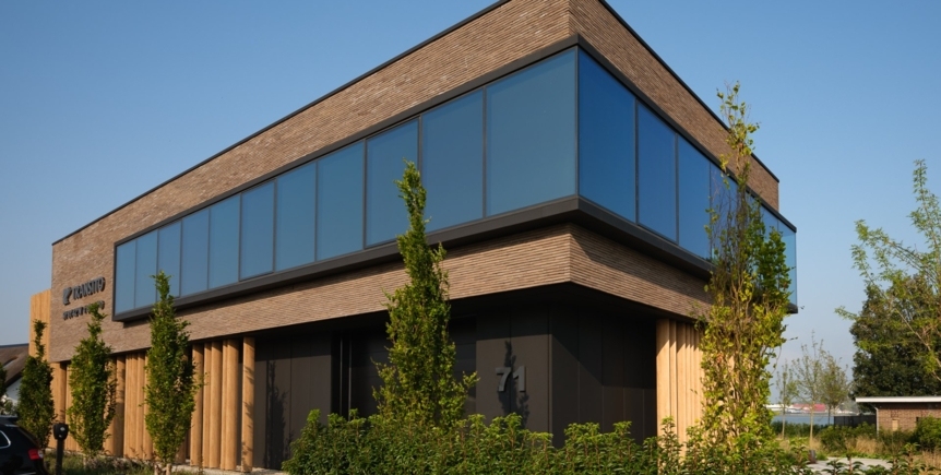 Ook de langwerpige en dunne designbakstenen van het Italiaanse S. Anselmo dragen bij aan het stijlvolle karakter van dit duurzame kantoor.