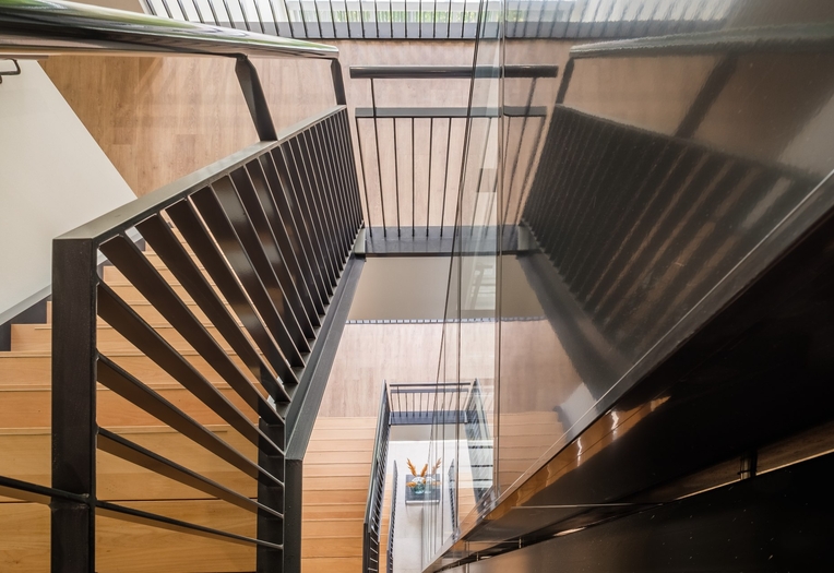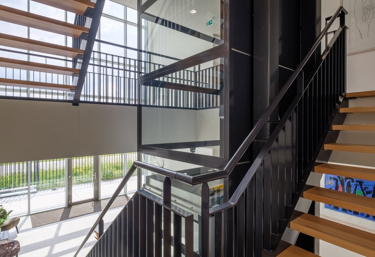 De entree van het kantoor beschikt over een ruime vide met een lift. Uniek aan dit project is dat de lift doorloopt tot op de dak-verdieping. Hier is een dakterras gecreëerd, door de dakranden boven het kantoorgedeelte door te laten steken.