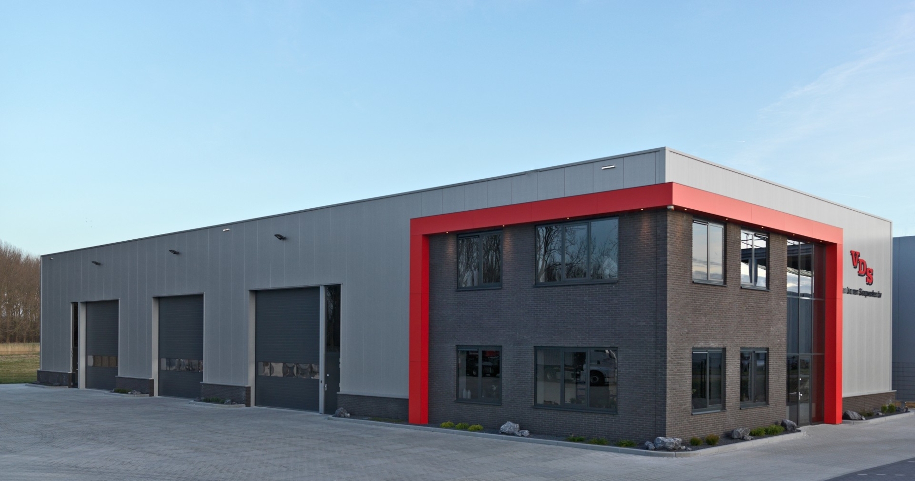 Het gebouw bestaat uit een werkplaats met een kraanbaan en een kantoor met ruime kantine