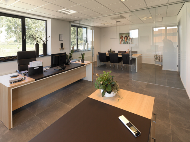 Een fraai kantoor aan de voorzijde en een ruime kantine plus het gereedschappen magazijn, wat hier speciaal wordt genoemd vanwege de fraaie uitstraling. Kortom een bedrijf met uitstraling. De moderne werkplaats, in combinatie met een groot eigen buitenterrein, maken het werken hier erg aangenaam.